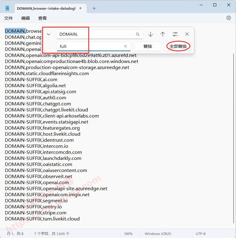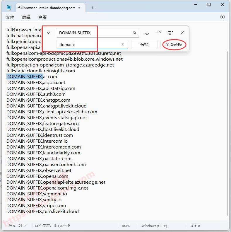 4、把“DOMAIN-SUFFIX,”替换为“domain:”,点“全部替换”;