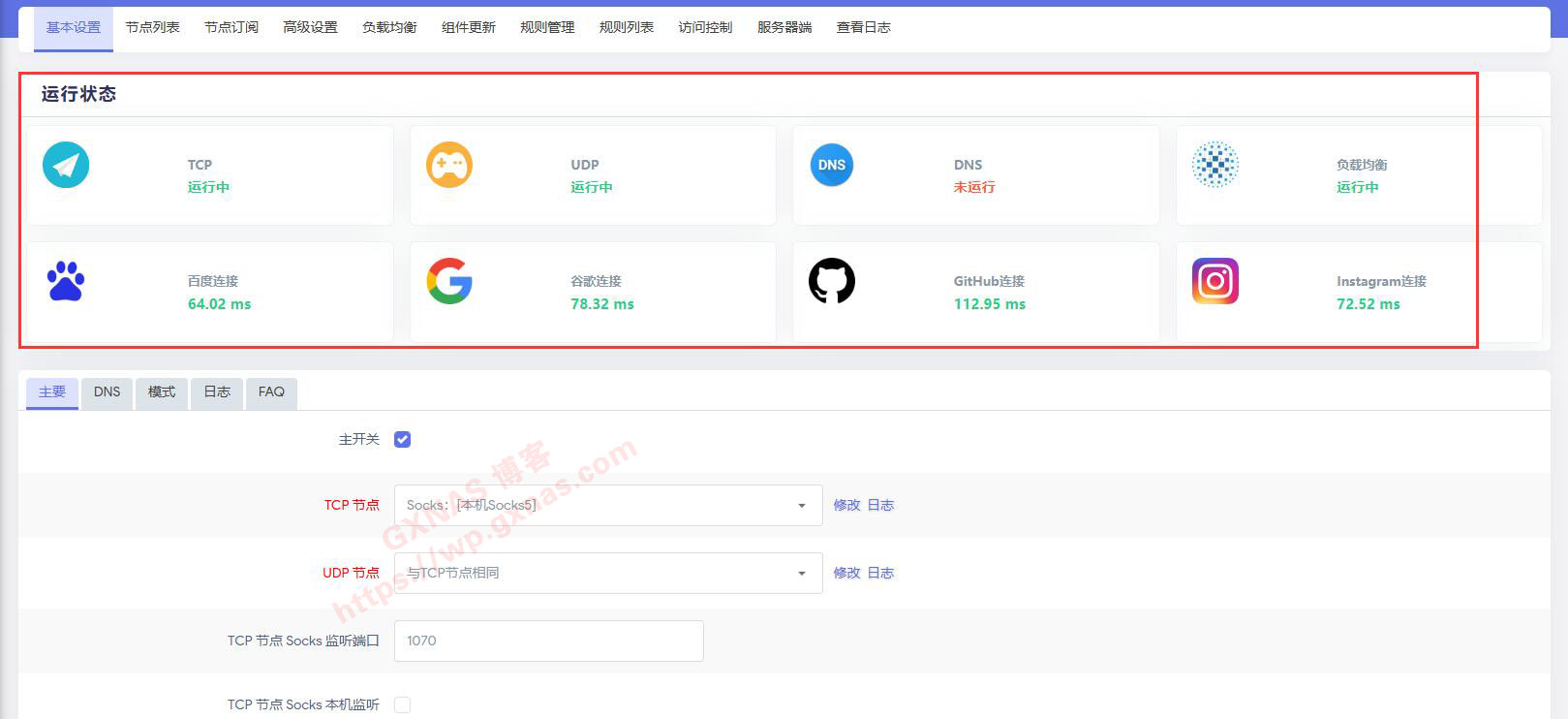 9、全部设置完成后就可以达到节点负载均衡以及按照分流规则同时使用不同节点的目的了。