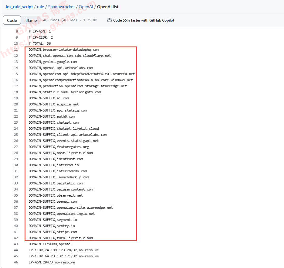 2、然后去打开这个【地址】,可以看到涉及到有关OpenAI的域名和IP,把“DOMAIN”开头和“DOMAIN-SUFFIX”开头所有的内容复制出来;