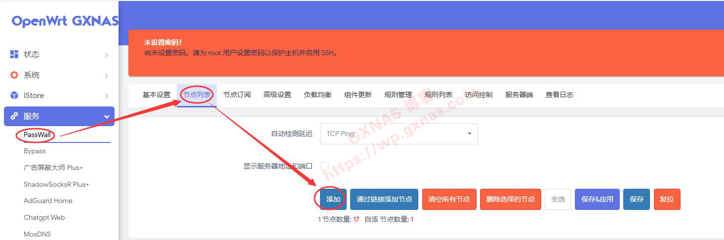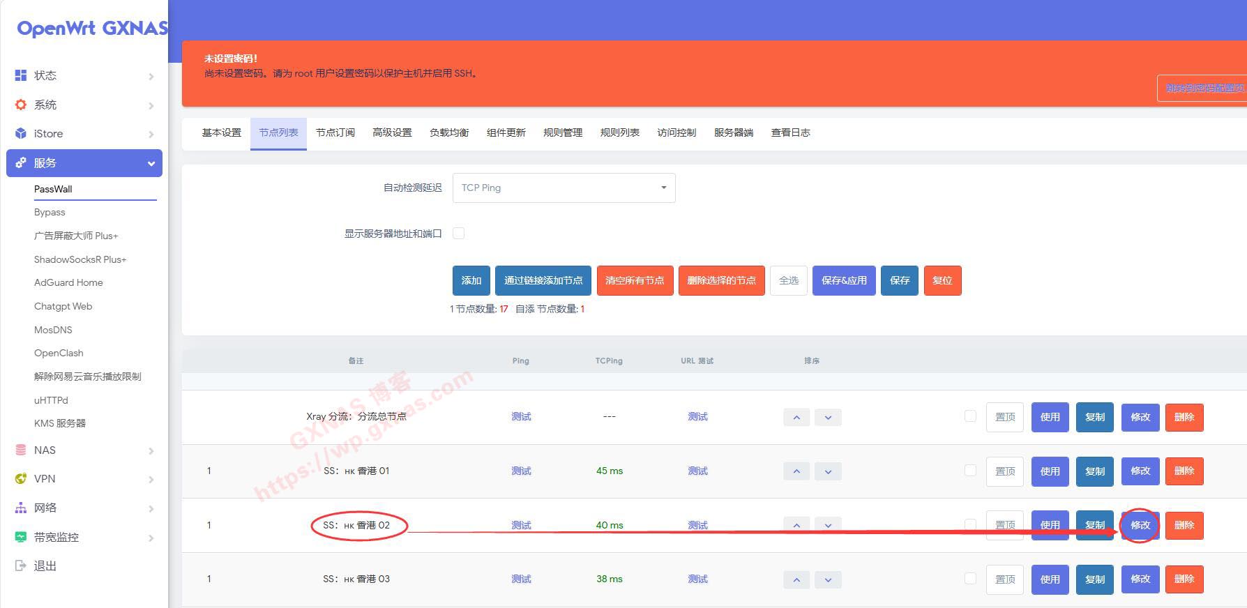 1、在进行以下的设置之前,先保证你安装的OpenWrt能联网并且你的机场节点可以正常科学出国,打开OpenWrt的Passwall插件,进入节点列表,随便找一个节点,点“修改”: