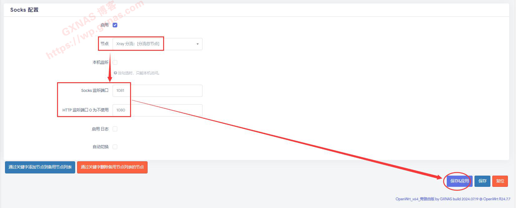 16、节点选择“Xray分流:分流总节点”,设置好Socks监听端口和Http监听端口,点右下角“保存&应用”;