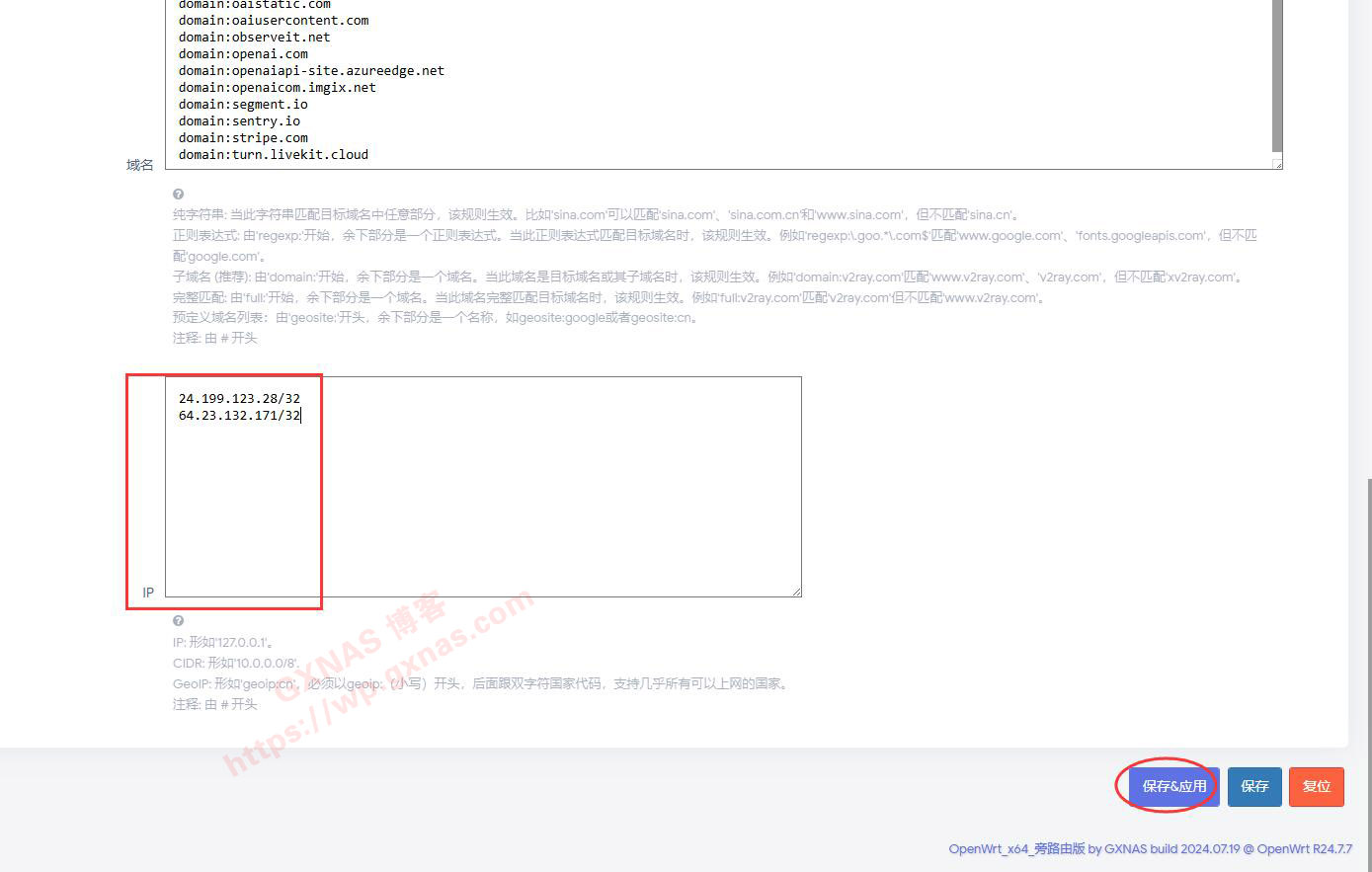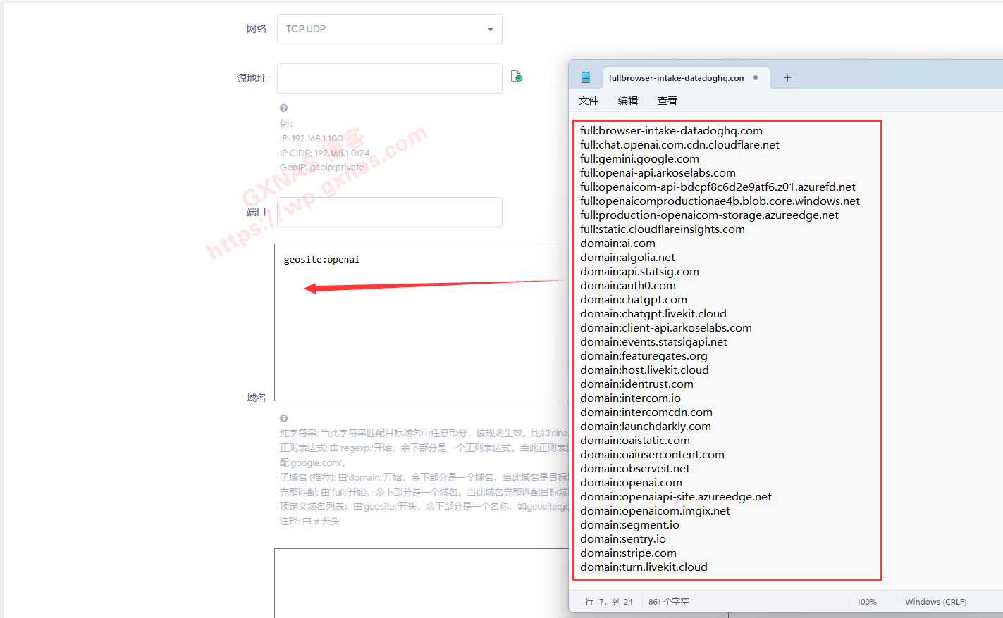 5、然后把记事本里面修改好的内容复制,到OpenWrt的“域名”处“geosite:openai”的下一行粘贴;