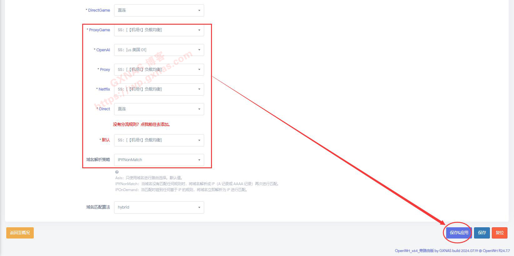 14、根据自己实际情况设置分流所使用的节点,OpenAI不可以使用港澳台的节点,建议使用美国节点,其他的使用选择第12个步骤建立好的“负载均衡”,设置完成后点右下角“保存&应用”;