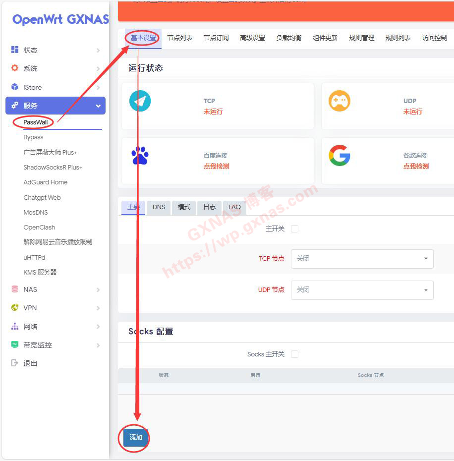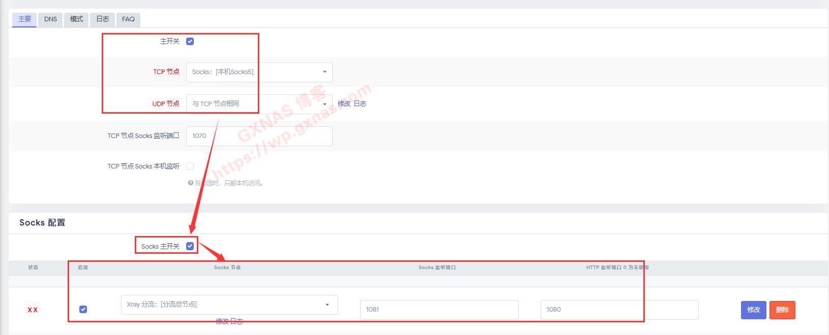 18、按照下图开启Passwall插件的总开关和Socks主开关,TCP节点选择“本机Socks5”,Socks5节点选择“Xray分流:分流总节点”,Socks监听端口和Http监听端口填写第16个步骤设置的端口号;
