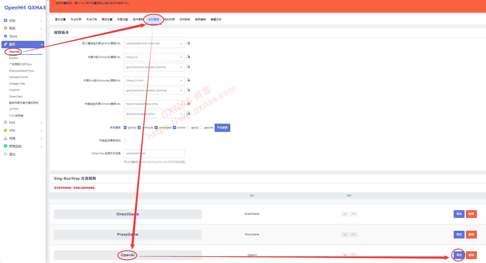 1、打开规则管理,比如我要对OpenAI的分流设置进行完善,找到OpenAI,修改;