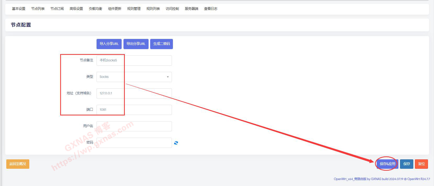 17、节点备注写“本机Socks5”,类型为“Socks”,端口为上一步骤设置的Socks端口号,点右下角“保存&应用”;