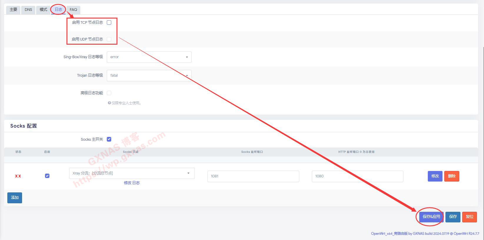 21、日志标签,把“启用TCP节点日志”和“启用UDP节点日志”两个地方的打勾去掉,点右下角“保存&应用”;