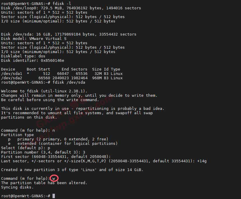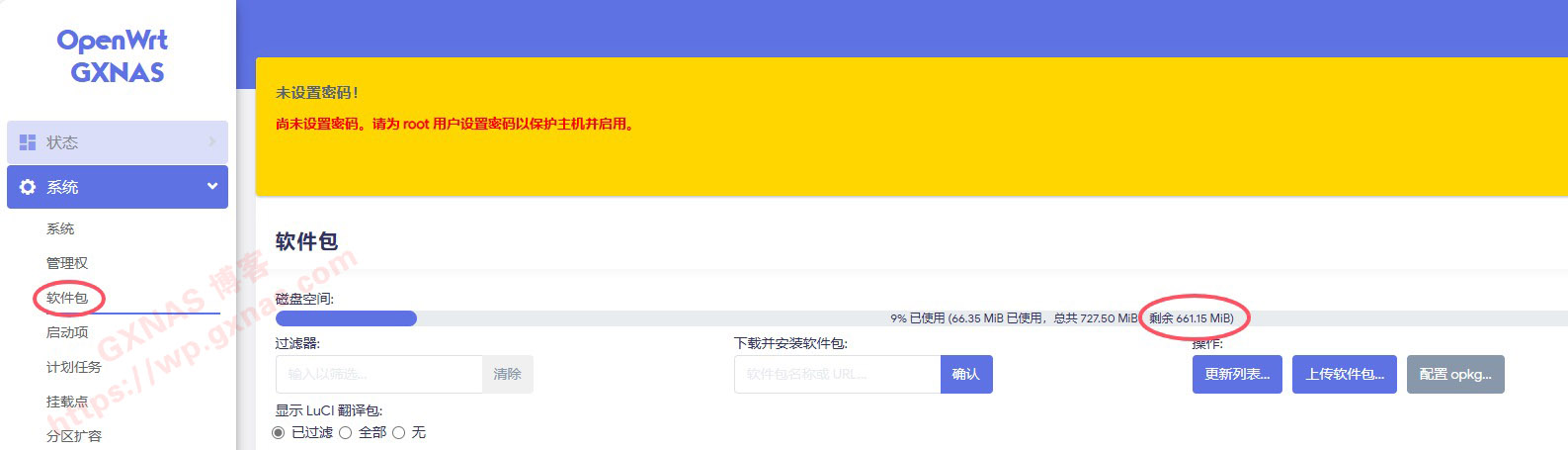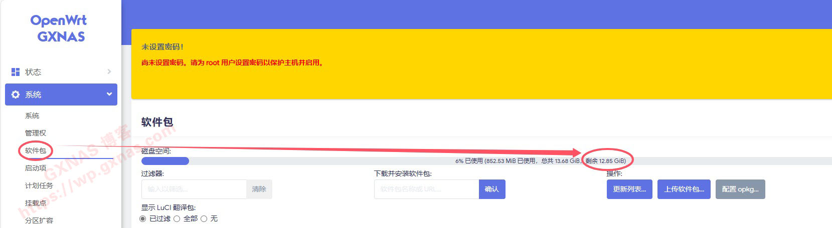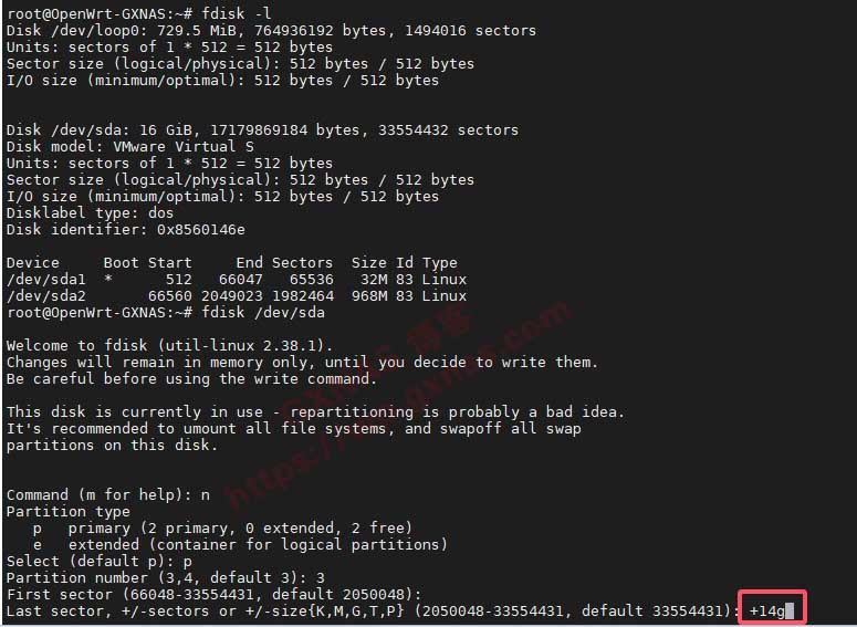 1、打开OpenWrt软路由系统的磁盘管理,看到该磁盘大小为16G,目前未分区的空间是15.02G;