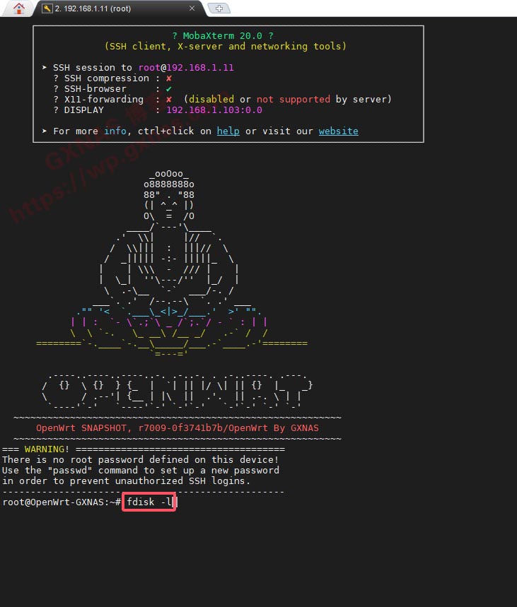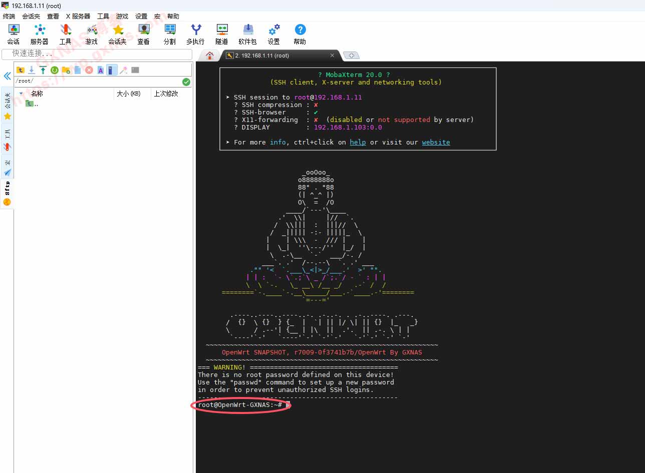 3、在电脑上使用SSH工具(我这里使用的是MobaXterm),用root账户登录到OpenWrt的SSH下,看到有root@开头的就是对的;