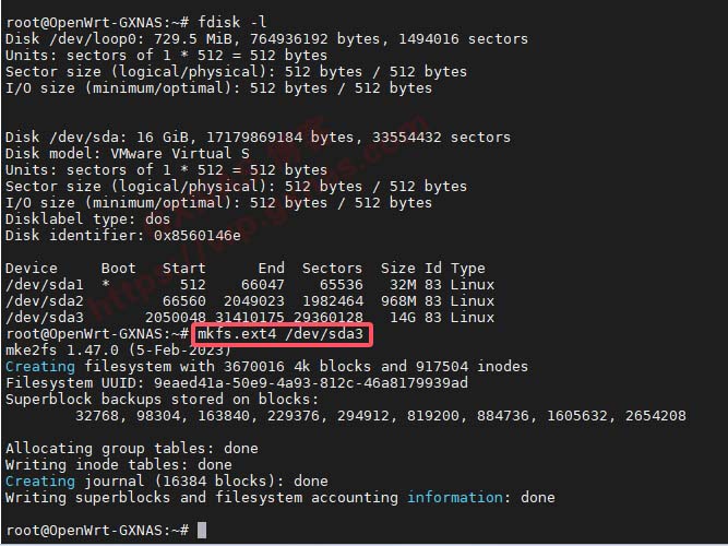 12、输入命令格式化/dev/sda3分区(/dev/sda3这个不要照抄,你的磁盘显示是什么名称就写什么):