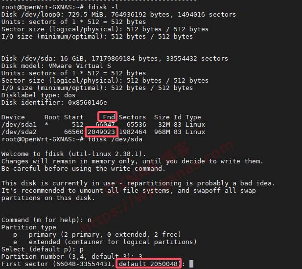 8、此时屏幕上会提示一个扇区值,需要比前面第5个步骤显示的扇区值对比值要大,我这里显示的是2050048所以直接回车就行了(如果显示的值比之前的小,就需要输入一个比前面第5个步骤要大的值);