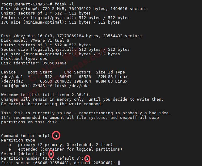 7、输入 n 回车建立新的分区,此时系统会提示是primary还是extended(如果使用的是Uefi固件则不提示),输入 p 回车(如果使用的是Uefi固件无此步骤),再输入3回车;