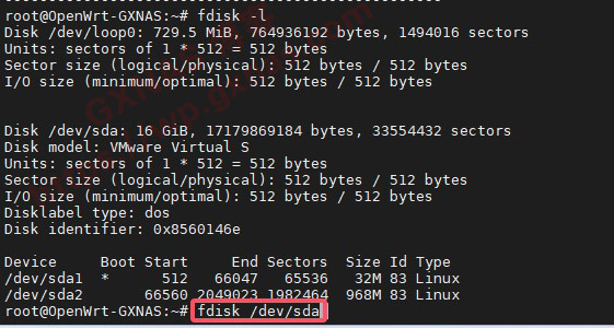5、磁盘名称为/dev/sda(把名称记下来后面需要用,不同的机器可能名称会不一样),磁盘大小为16G,目前有两个分区分别为/dev/sda1和/dev/sda2,/dev/sda2分区最后的扇区值为2049023(把这个值记下来后面需要用);