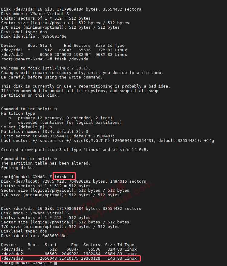 11、再次输入命令查看磁盘分区情况,可以看到多出来一个分区/dev/sda3,大小是14g: