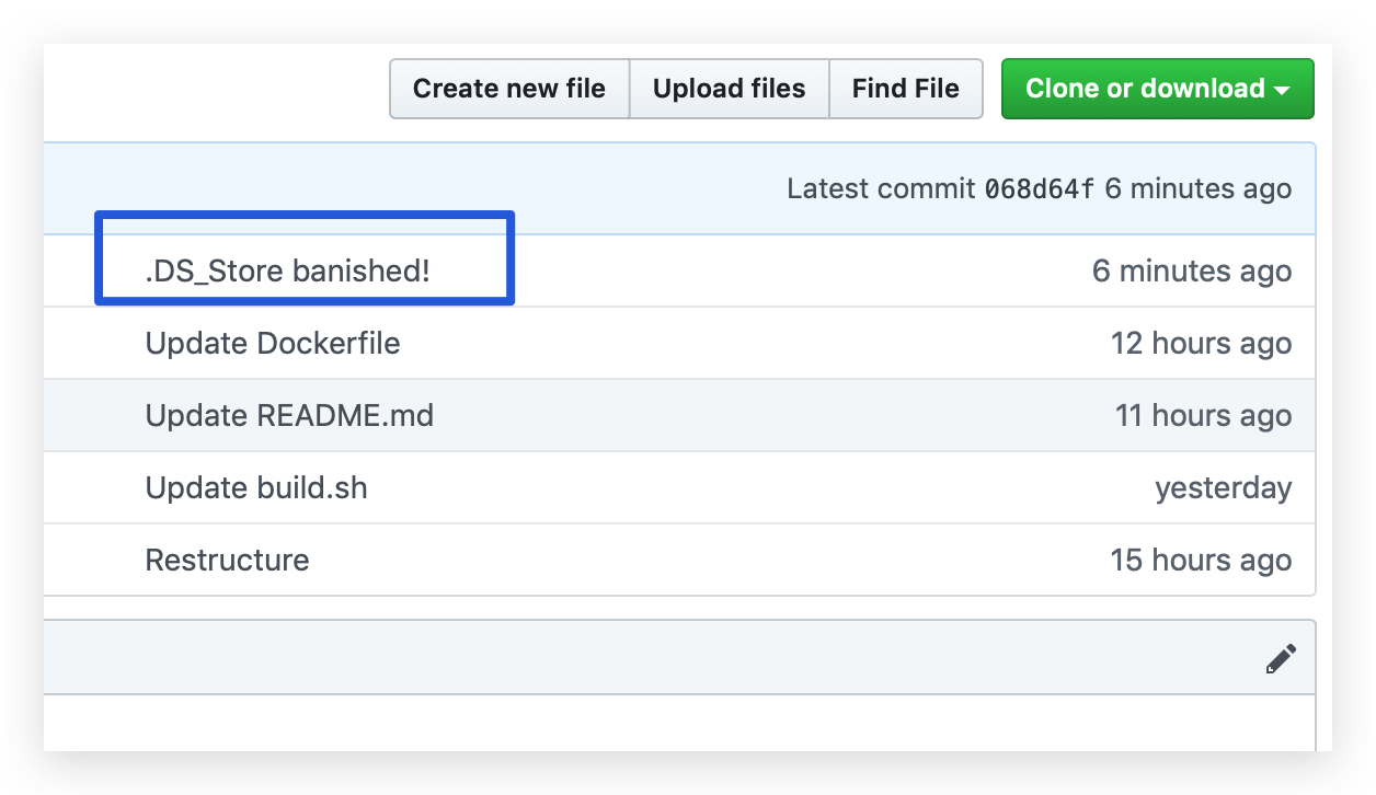 1 2 3 4 5 6 7 8 | # 删除项目中的所有.DS_Store。这会跳过不在项目中的 .DS_Store# cd 你的项目目录find . -name .DS_Store -print0 | xargs -0 git rm -f --ignore-unmatch# 将 .DS_Store 加入到 .gitignoreecho .DS_Store >> ~/.gitignore# 更新项目git add --allgit commit -m '.DS_Store banished!' |