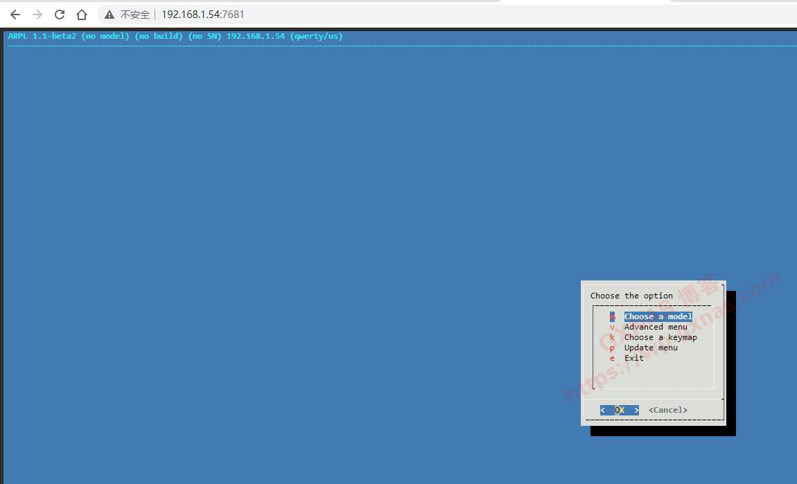 9、在电脑浏览器打开第3步获取到的IP地址,后面加:7681,回车,进入ARPL编译菜单,在第一行“Choose a model”处回车;