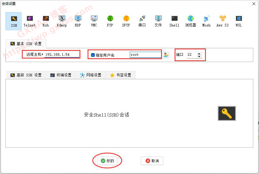 4、在电脑上打开SSH工具,我使用的是MobaXterm,填写上一步骤获取到的IP地址,用户名为root,端口22,登录;