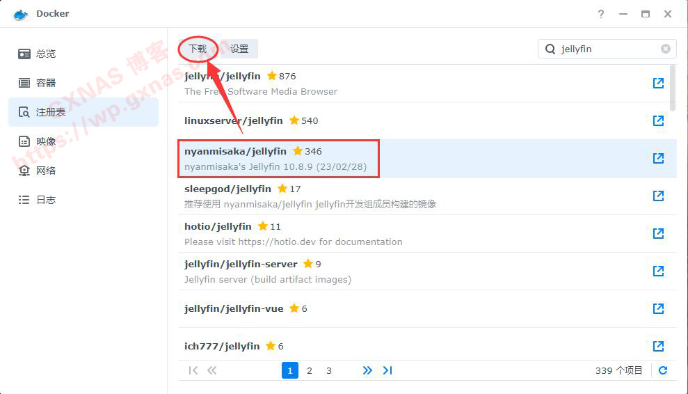 7、Docker搜索到很多,找到我安装使用的容器,点下载;
