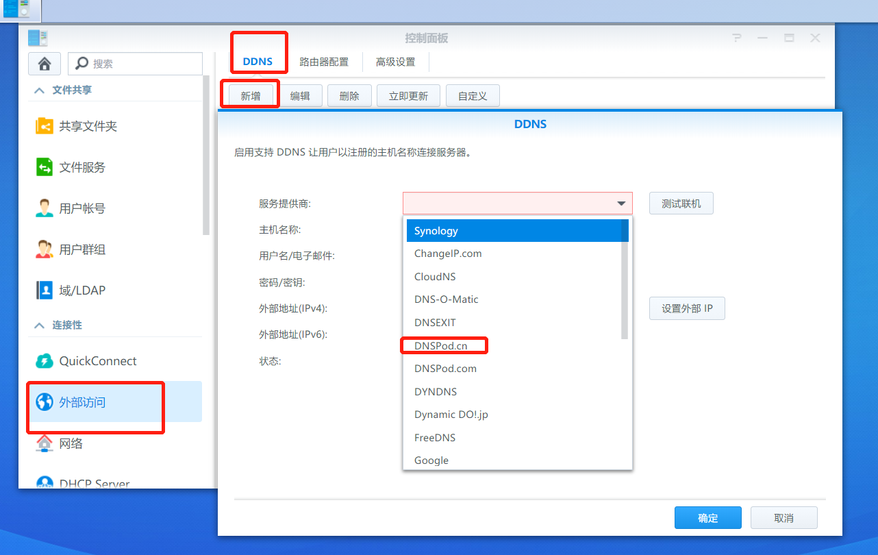 打开控制面板,添加DDNS,选择dnspod.cn
