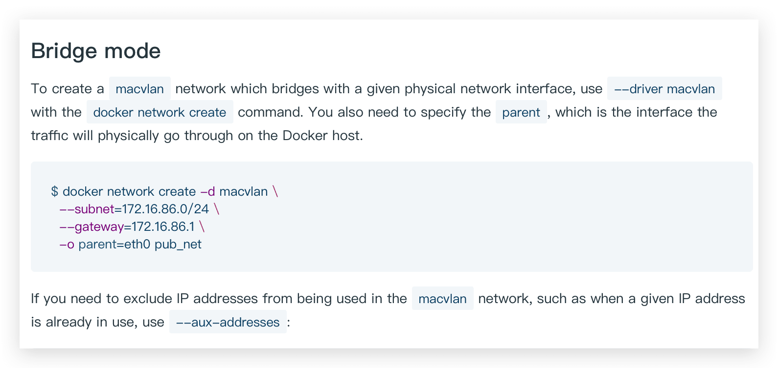 有些应用程序,特别是传统的应用程序或监控网络流量的应用程序,希望直接连接到物理网络。在这种类型的情况下,你可以使用macvlan网络驱动为每个容器的虚拟网络接口分配一个MAC地址,使其看起来是一个直接连接到物理网络的物理网络接口。在这种情况下,你需要在你的Docker主机上指定一个物理接口用于macvlan,以及macvlan的子网和网关。你甚至可以使用不同的物理网络接口来隔离你的macvlan网络。请记住以下几点。
