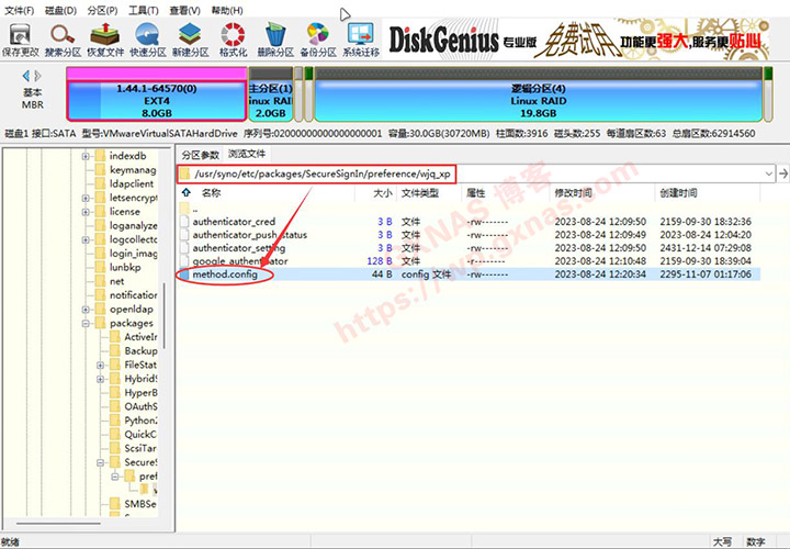 2、利用PE系统里面的DiskGenius专业版软件,找到下图你的管理员路径下的method.config文件,复制到别处;
