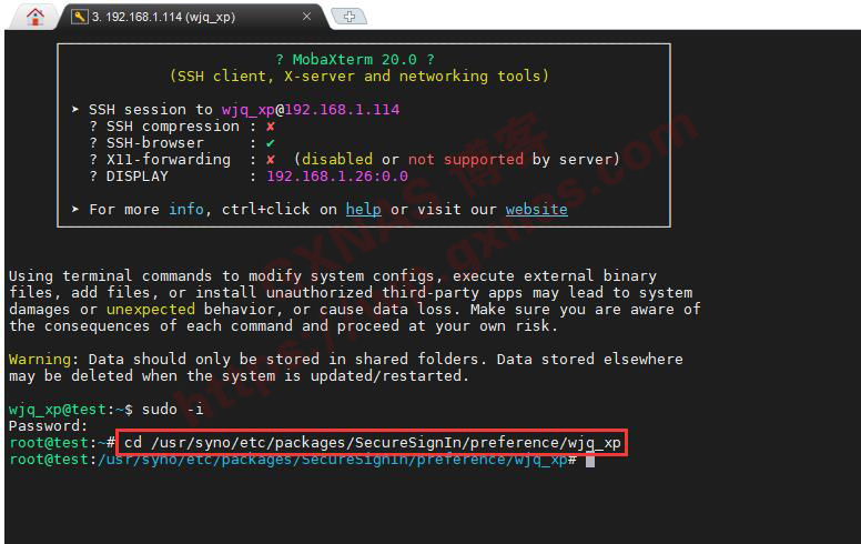 6、复制以下代码,把账号名称修改为你的群晖系统对应的管理账号(本教程管理员账号为wjq_xp),然后到SSH下输入命令回车(注意代码的字母有大小写之分,不要写错了);