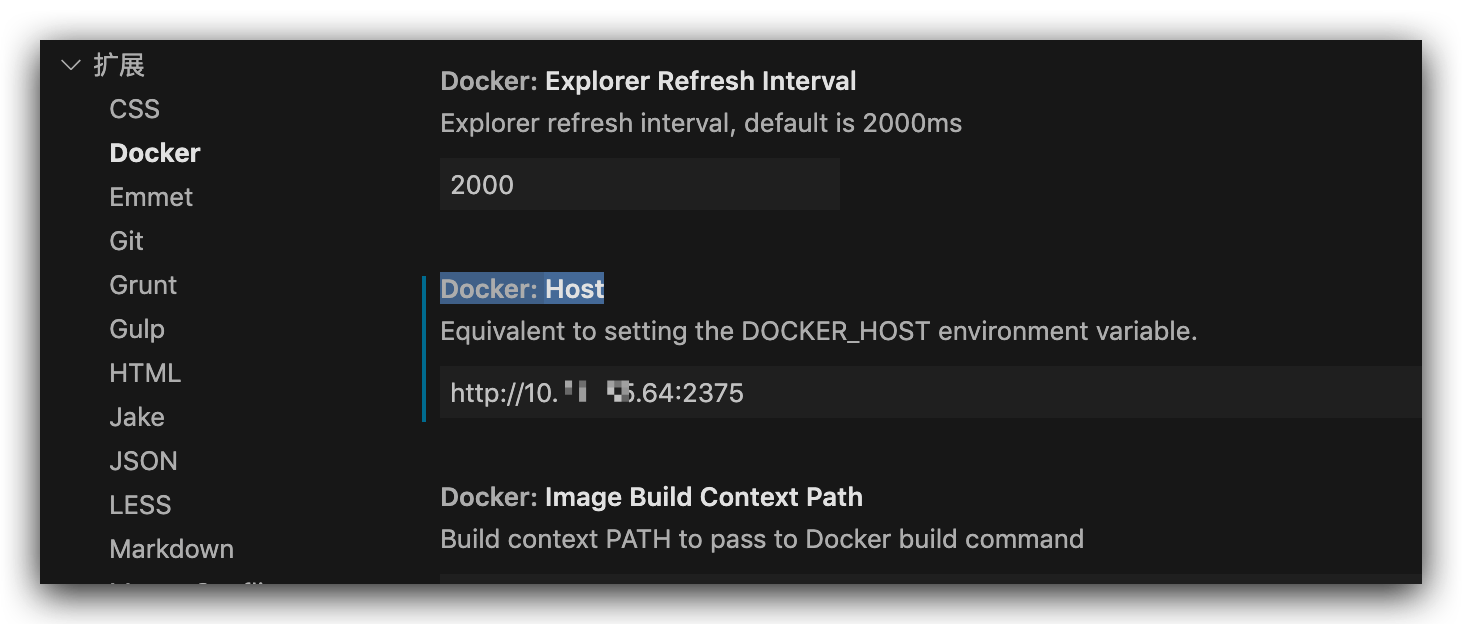 之后在vscode设置中搜索Docker: Host,修改为远程docker服务器的地址即可,不知道怎么开启docker远程访问的可以参考我另一篇文章,这里不再赘述