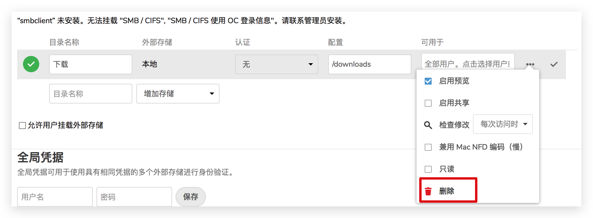 我也是这这阵子才发现我搭建的NextCloud挂载外部存储无法删除文件,在遍寻全网后终于找到解决办法