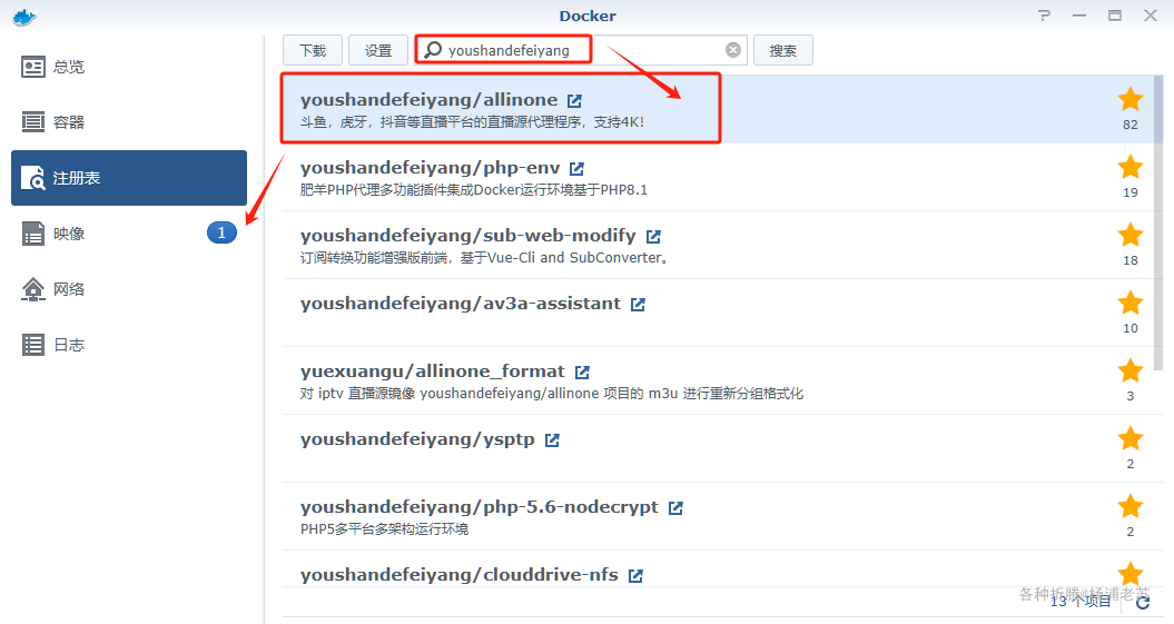 在注册表中搜索 youshandefeiyang ,选择第一个 youshandefeiyang/allinone,双击直接下载。