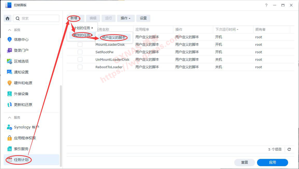 1、打开群晖控制面板,任务计划,新增,触发的任务,用户定义的脚本;