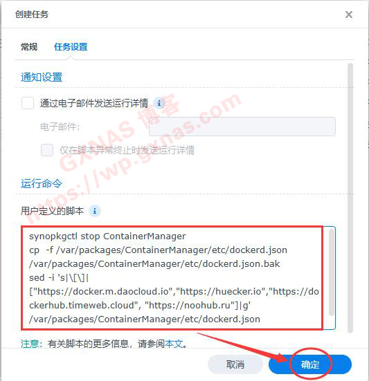 3、在“任务设置”标签中,把下面的内容复制到用户定义的脚本中(原理是给当前群晖ContainerManager套件添加四个docker镜像服务器地址,这四个服务器均架设在俄罗斯),确定;