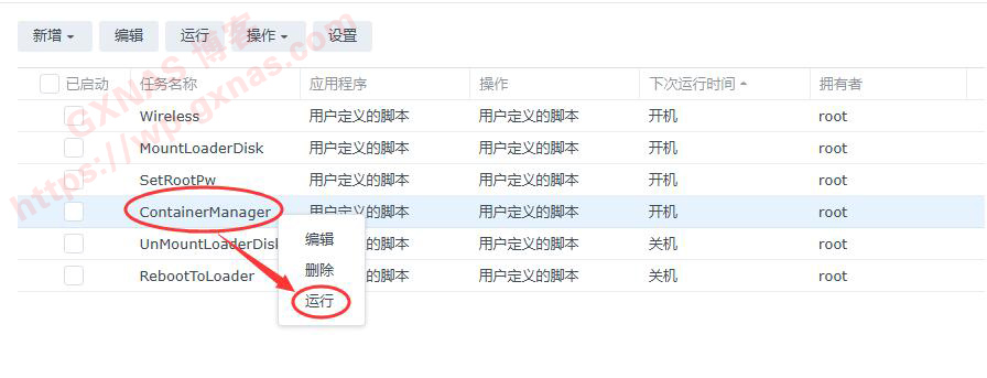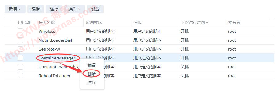 8、运行这个任务的时候,ContainerManager套件会自动停止,然后过几秒钟ContainerManager套件会自动重新启用,当看到ContainerManager套件恢复启用的时候,把任务计划中的“ContainerManager”点鼠标右键,删除;