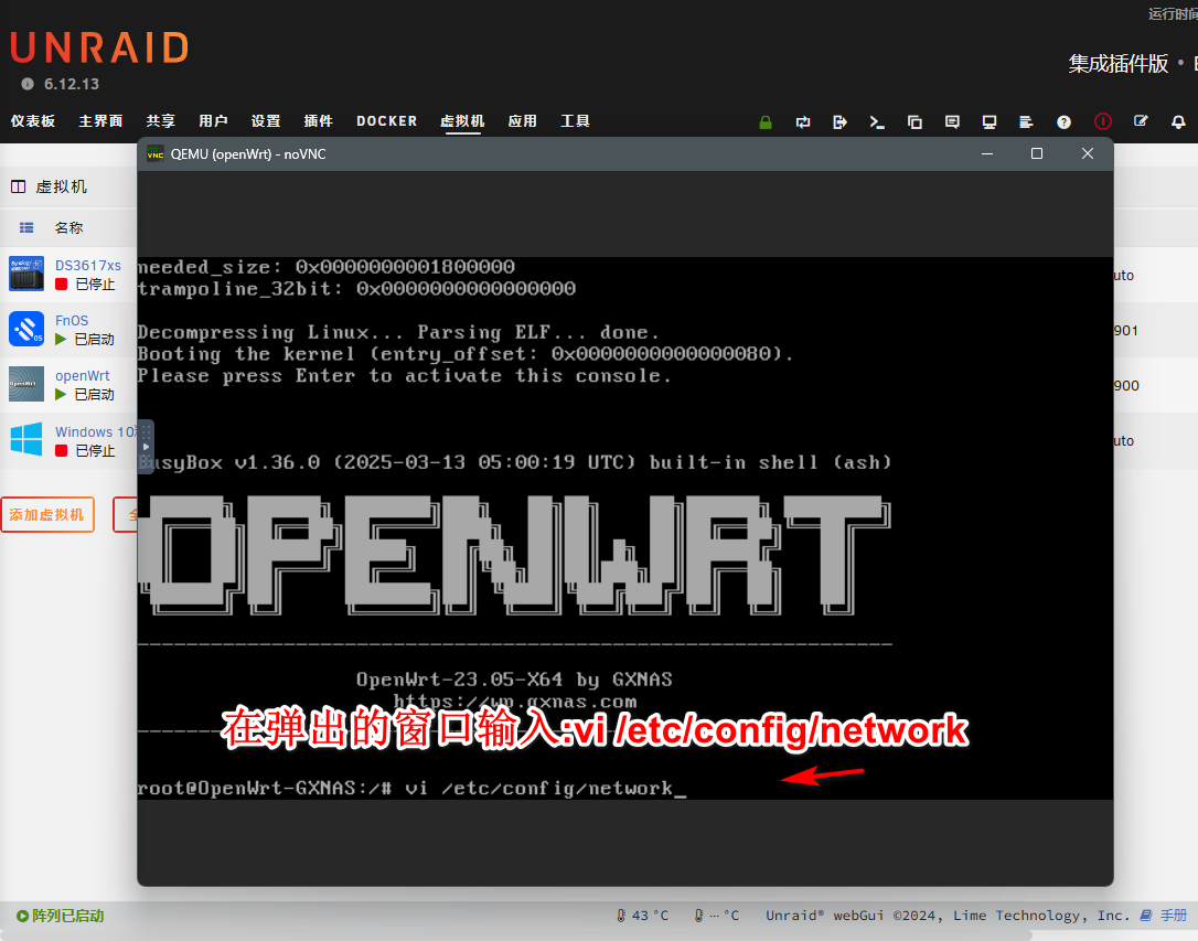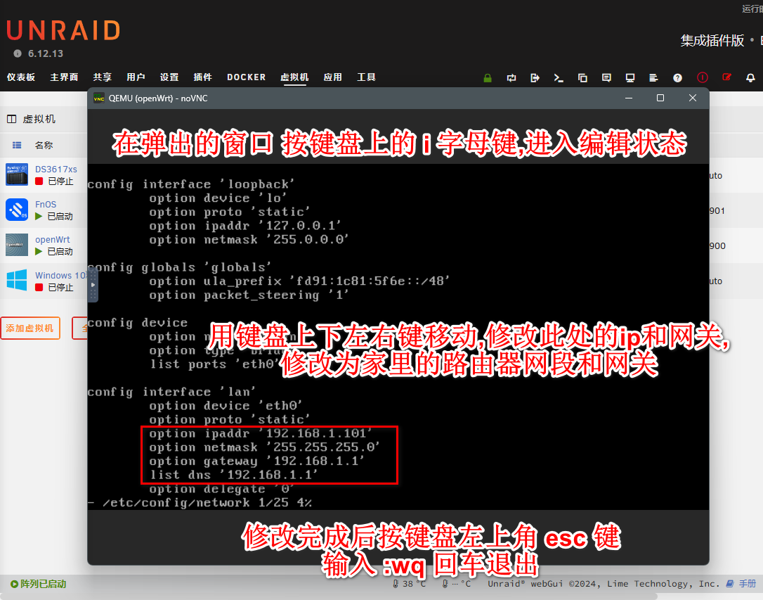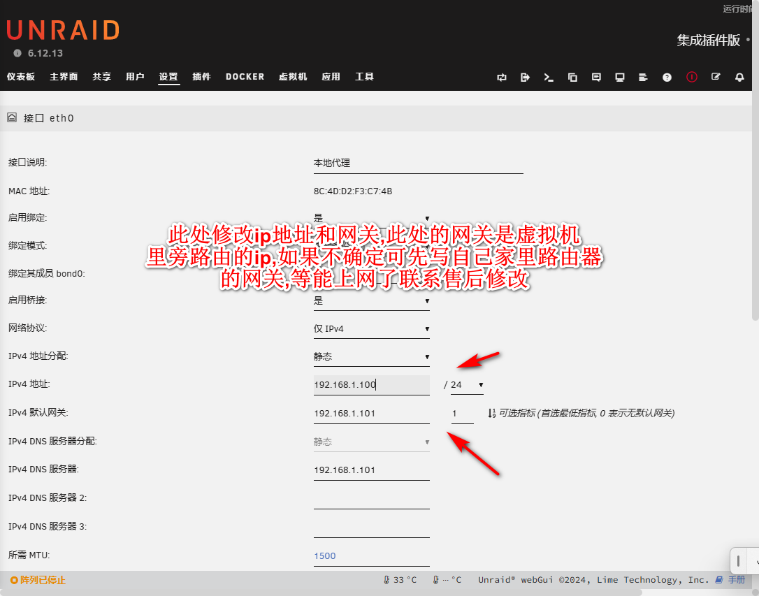 3.第一次开机初始化,如果家里网段不是192.168.1.1-255,的需要修改unraid系统地址方法: