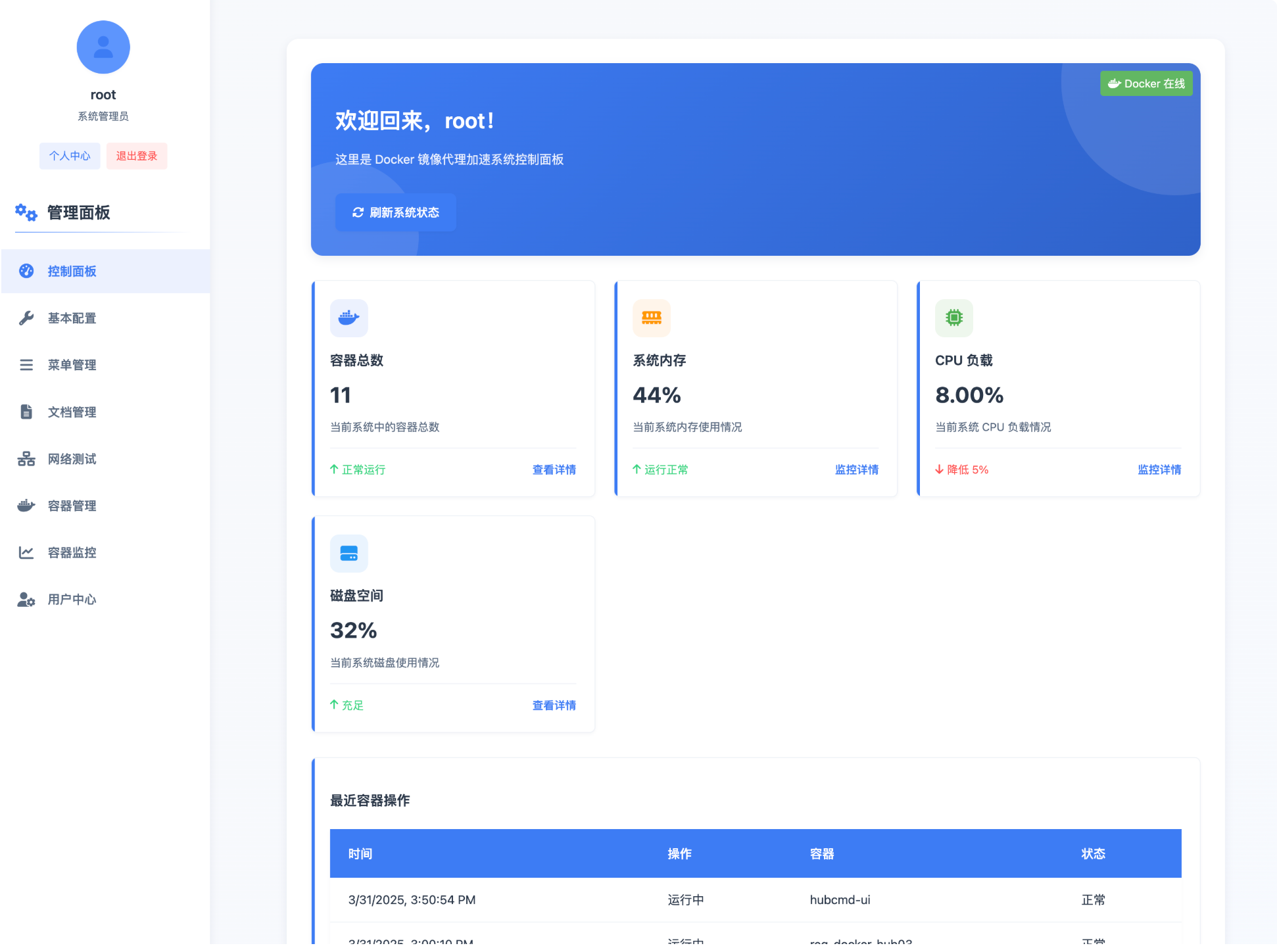 •  HubCMD-UI服务,面板展示、镜像搜索、文档教程、容器管理、容器监控、网络测试、用户中心等功能