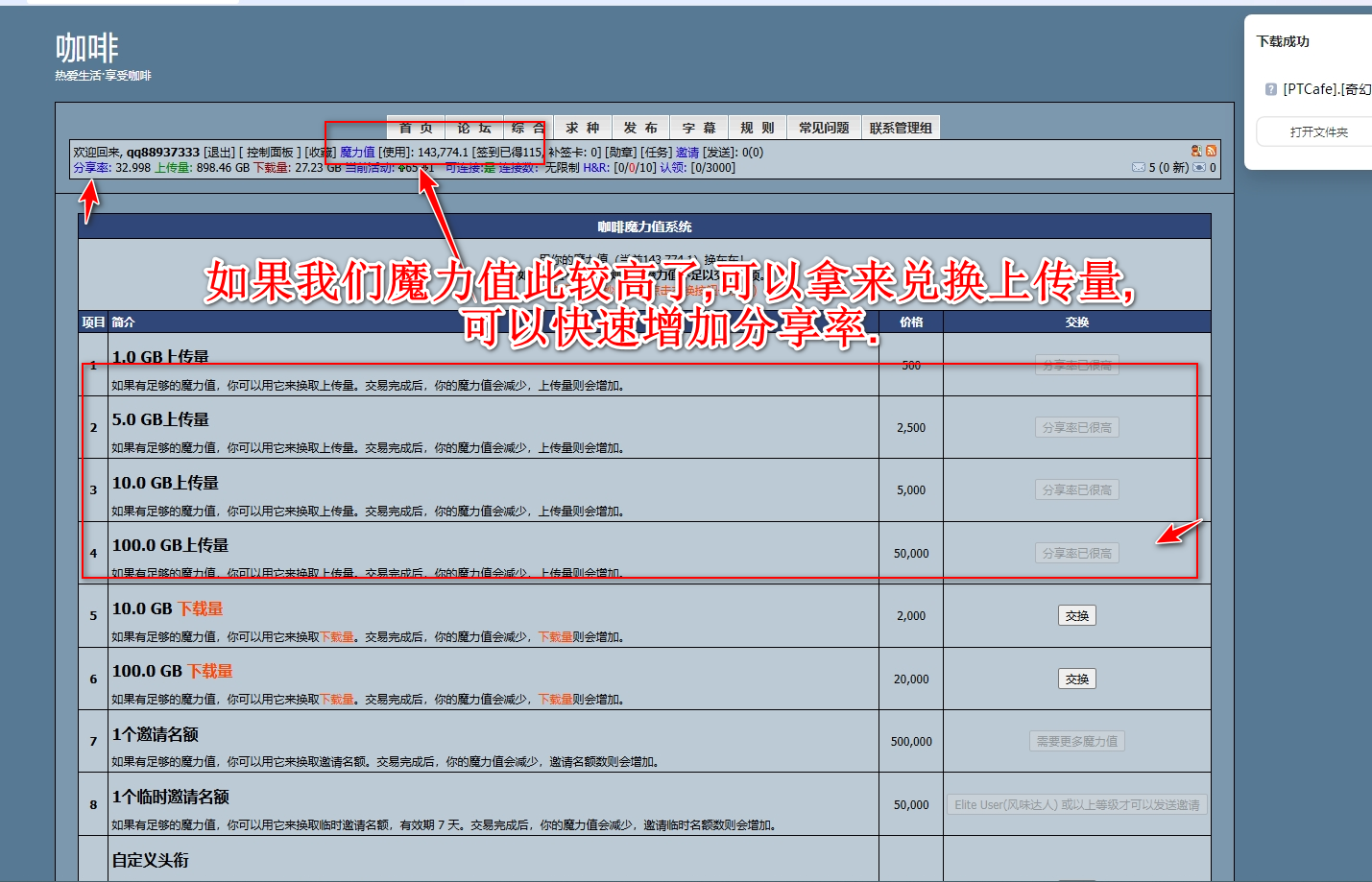 3. 如果魔力值比较 高了,可以使用它,把它兑换成上传量,快速增加分享率.可以多次兑换.