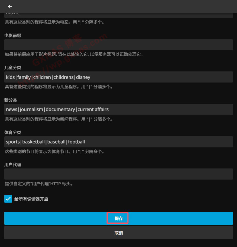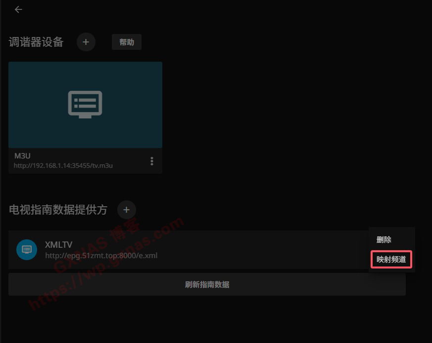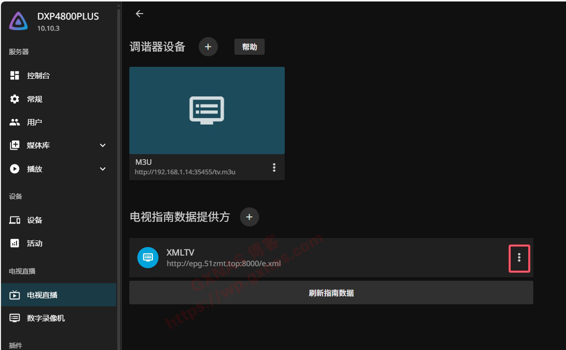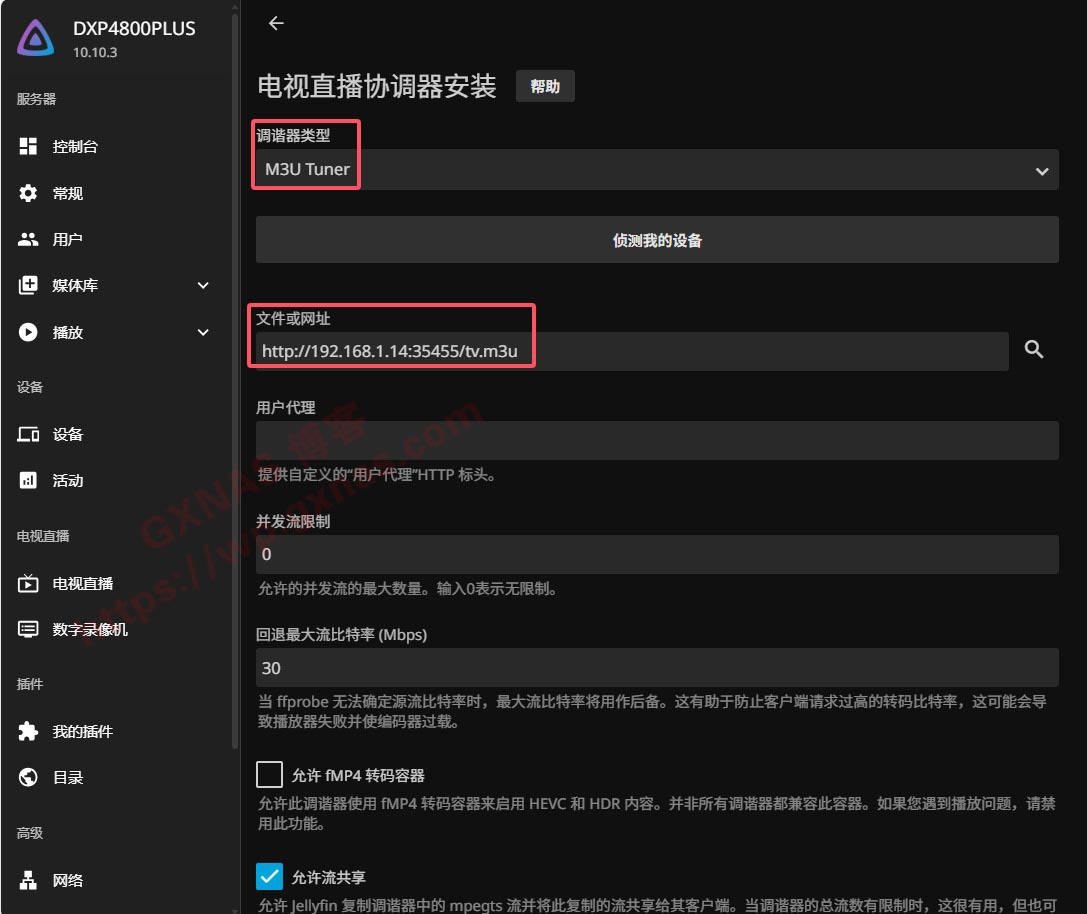 18、调谐器类型选“M3U Tuner”,文件或网站处填写http://NAS的IP地址:35455/tv.m3u;