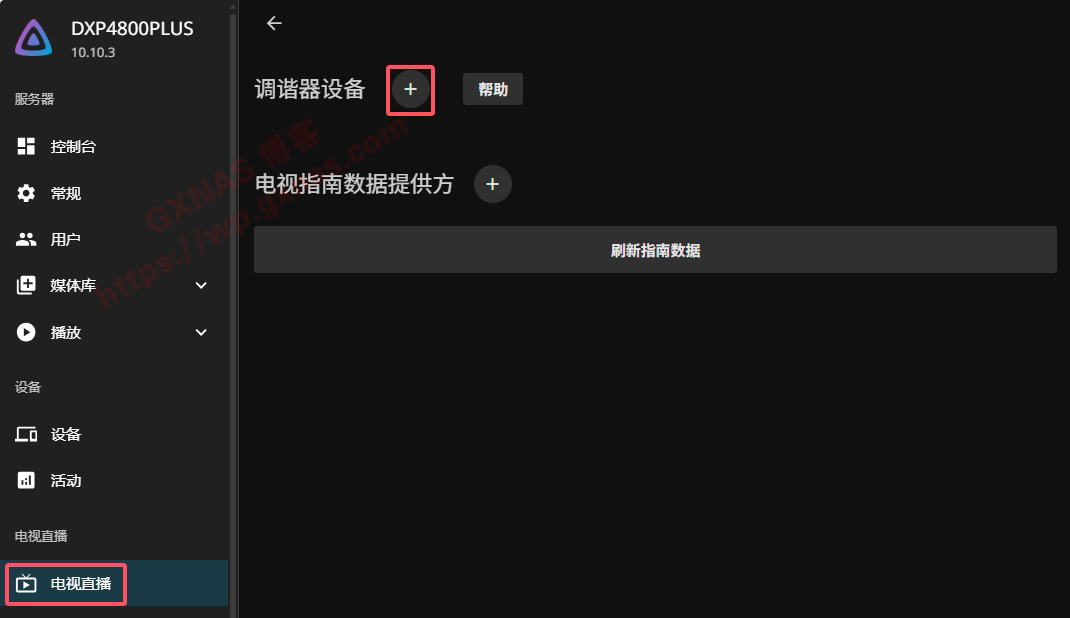 17、在浏览器打开http://NAS的IP地址:8096,按照屏幕提示设置账号和密码,登录进来,进入控制台,电视直播,在“调谐器设备”点“+”;