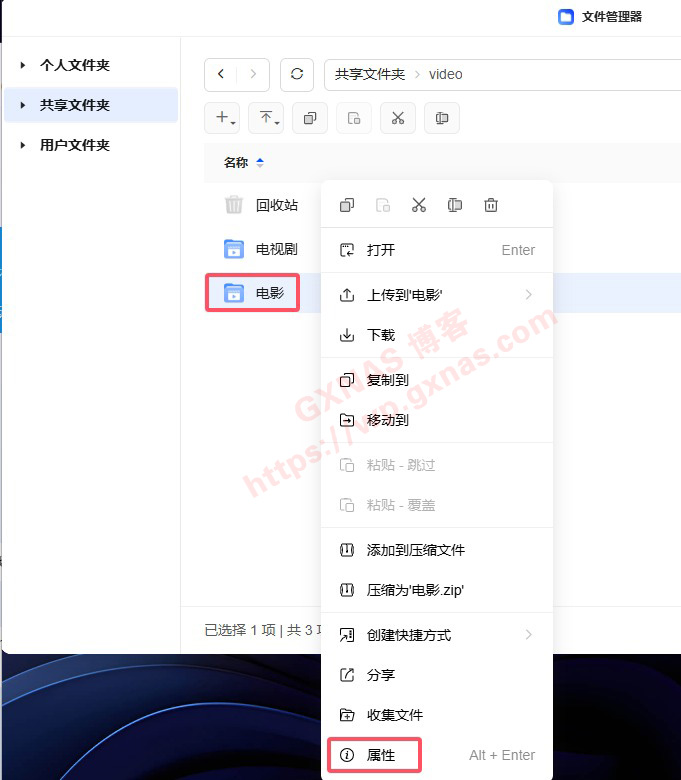 6、比如朋友这台影音文件是在共享文件夹下的video文件夹,里面有电影和电视剧,先在电影文件夹点右键,属性;