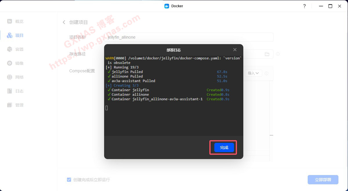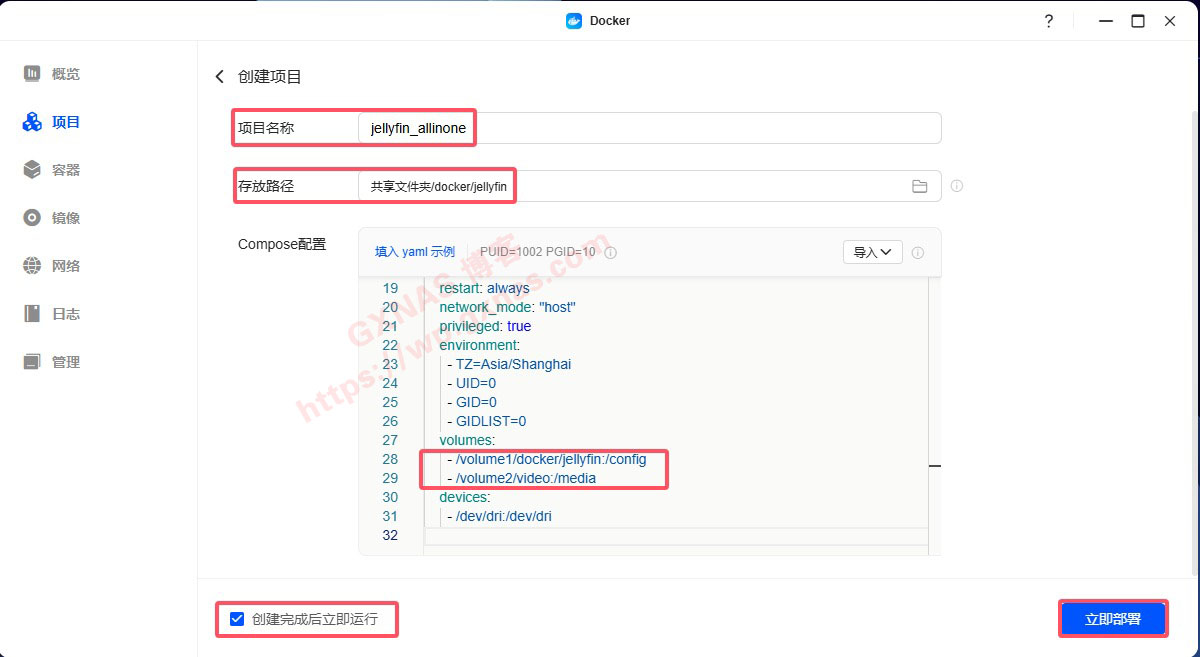 12、项目名称写jellyfin_allinone,存放路径设置在docker下的jellyfin文件夹,把下面的内容复制到记事本中,根据自己实际路径修改:第22行的/volume1/docker/jellyfin修改为本教程第4个步骤复制的路径,第23行的/volume2/video修改为本教程第6个步骤获取路径的上一级路径(比如本来是“/volume2/video/电影”的路径,只要“/volume2/video”就行了),修改好路径后重新复制到下图的Compose配置中粘贴,在“创建完成后立即运行”处打勾,立即部署;