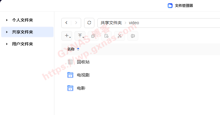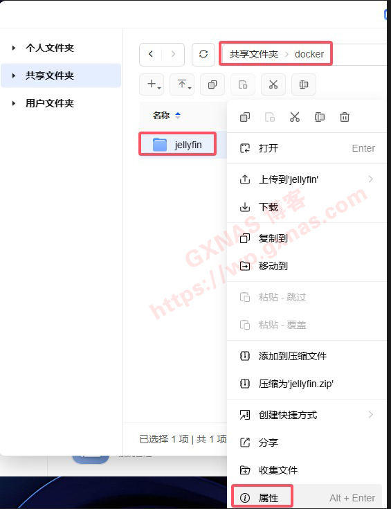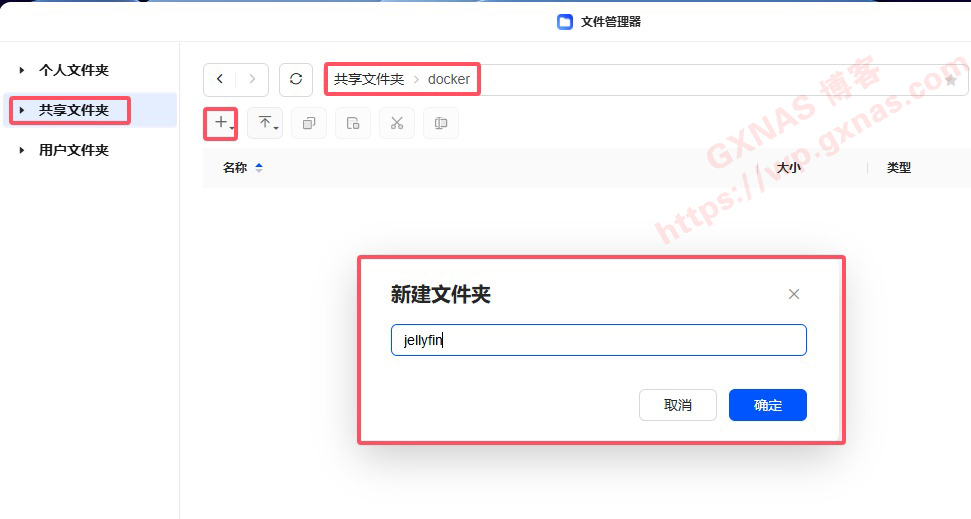 2、打开文件管理器,在共享文件夹-docker这个文件夹下,新建文件夹,名称为jellyfin,确定;