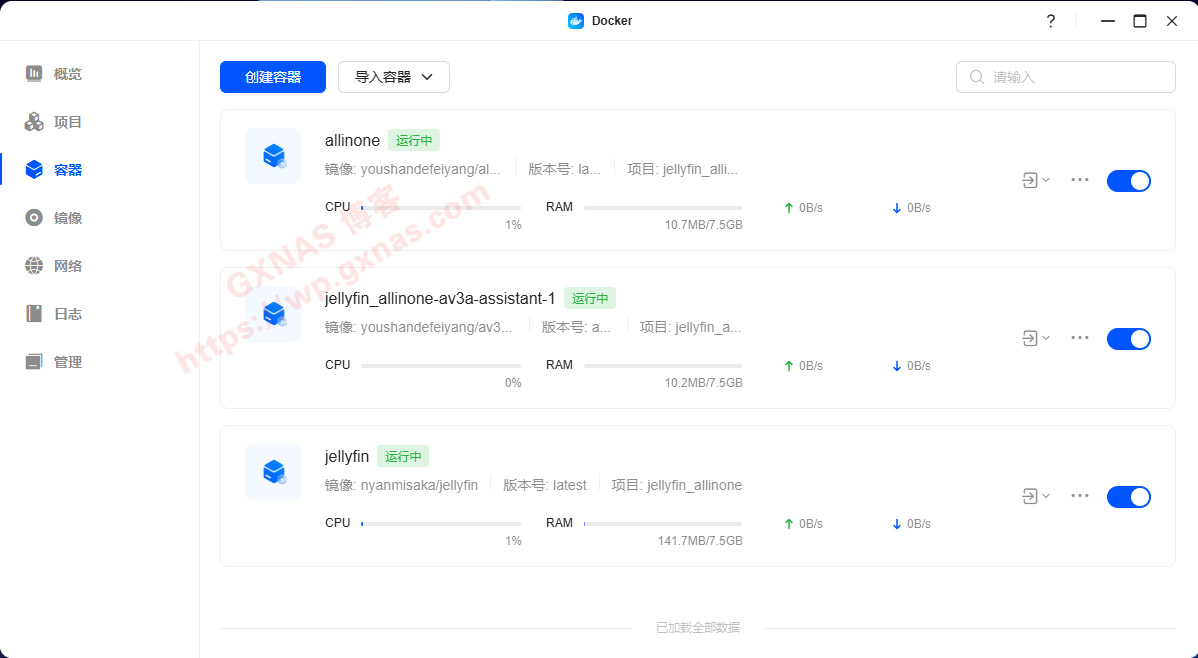 15、看到项目中有2个容器(2024年12月25日更新:由于av3a-assistant这个项目作者已经删库,实际运行中只有2个容器),显示“运行中”,就表示可以使用了;