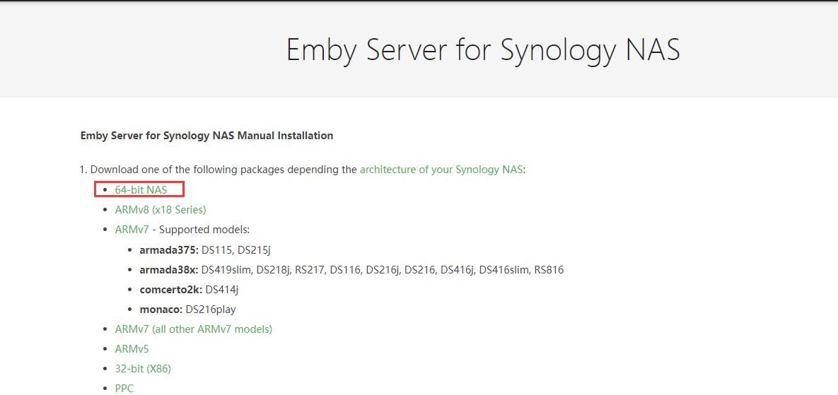 1,在电脑浏览器打开【EMBY官网】,群晖DSM7.X系统的点“Synology”进去,群晖DSM6.X系统的点“Synology(DSM 6)”进去: