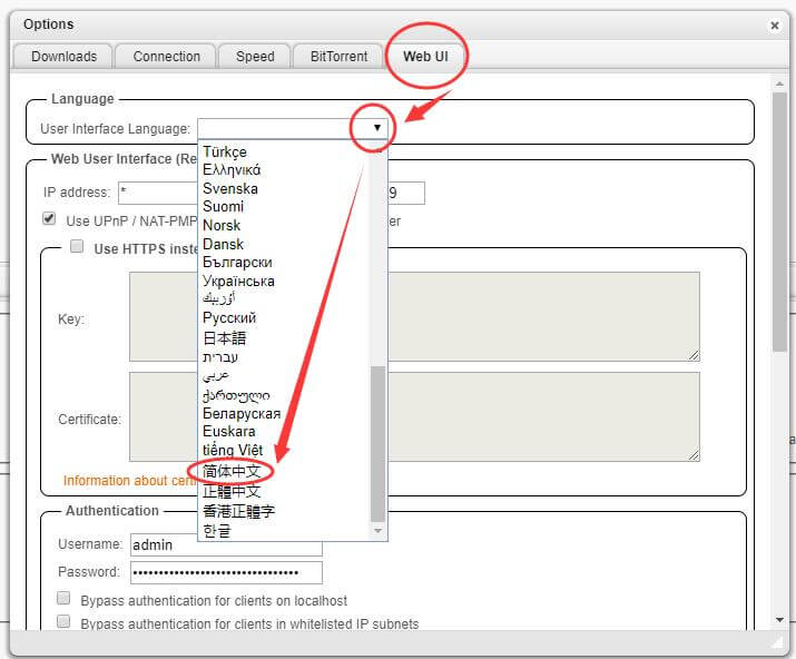 26、点Web UI标签的Language三角形标志,下拉到底部,选择简体中文
