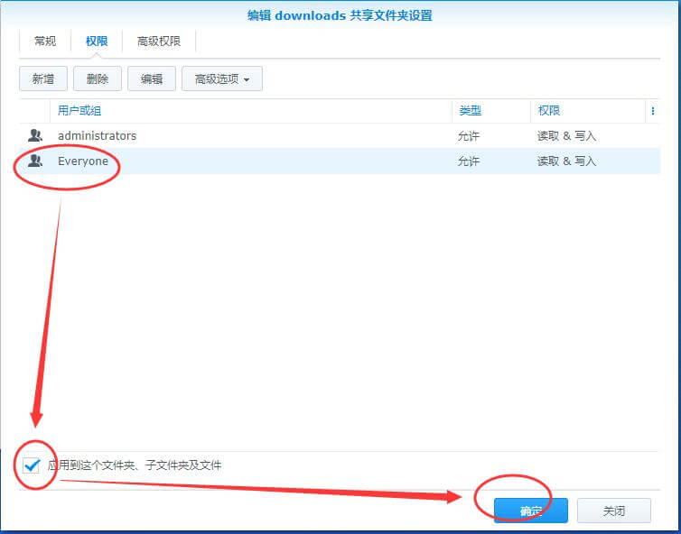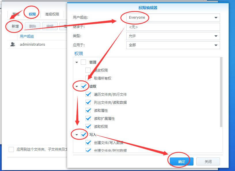 7、在权限标签栏,新增,选择Everyone用户组,勾选读取和写入,应用