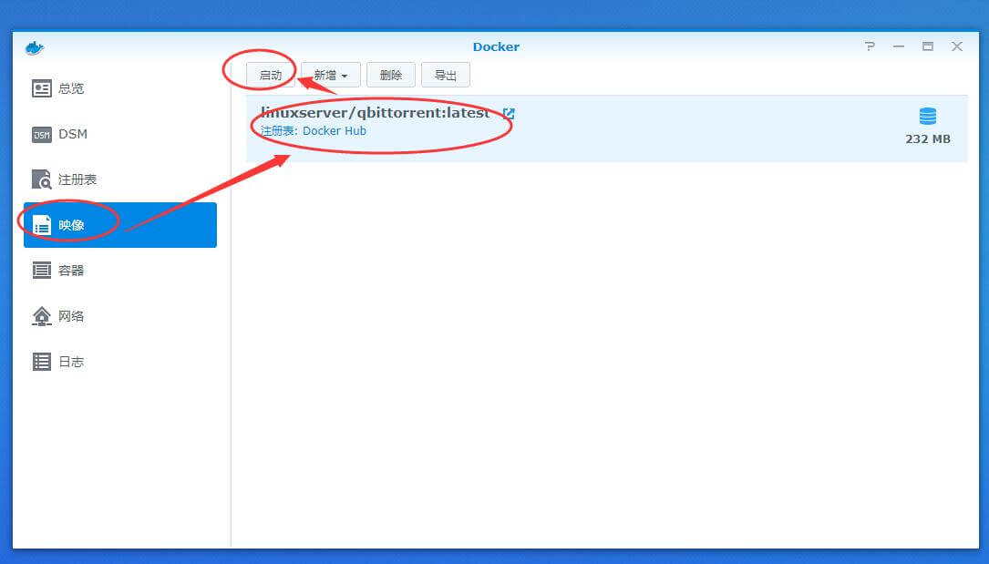 15、稍等几分钟右上角提示下载完成后,在左边菜单点映像,在linuxserver/qbittorrent这行点一下,再点启动