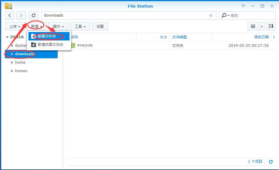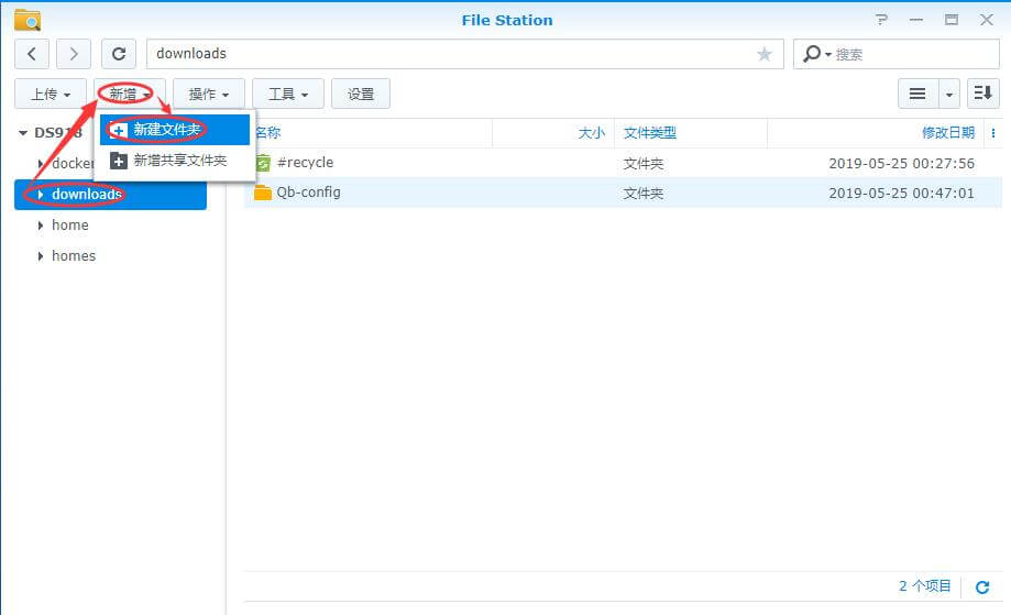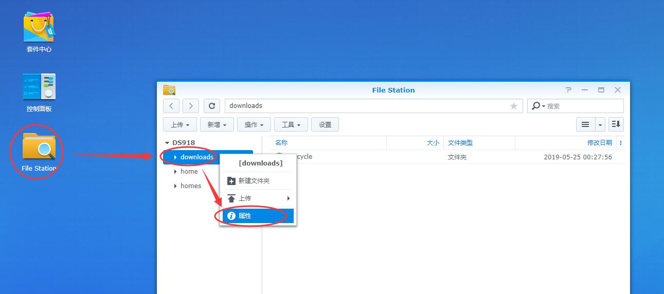 6、打开File Station,在刚才我们新建的downloads文件夹上点右键,属性