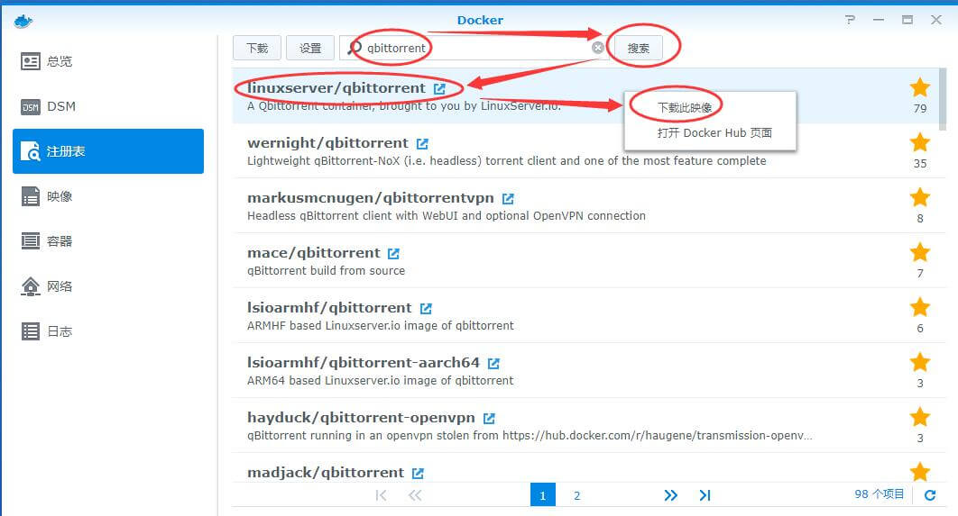 13、打开docker,在注册表输入qbittorrent,搜索,在linuxserver/qbittorrent这行点右键,下载此映像