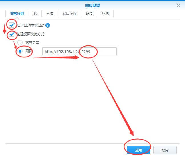 17、勾选启用自动重新启动,勾选创建桌面快捷方式,点网页并在IP地址后面输入:5299