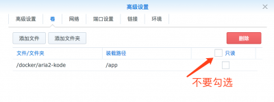 在 “卷” 菜单中,为创建的容器添加一个文件夹用来管理和查看我们通过aria2下载的文件。因为要存储新文件,所以这里不要勾选 “只读” 项。