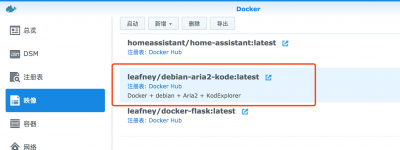 打开群晖的docker套件,选择 “注册表” 项,搜索并下载镜像 leafney/debian-aria2-kode 。